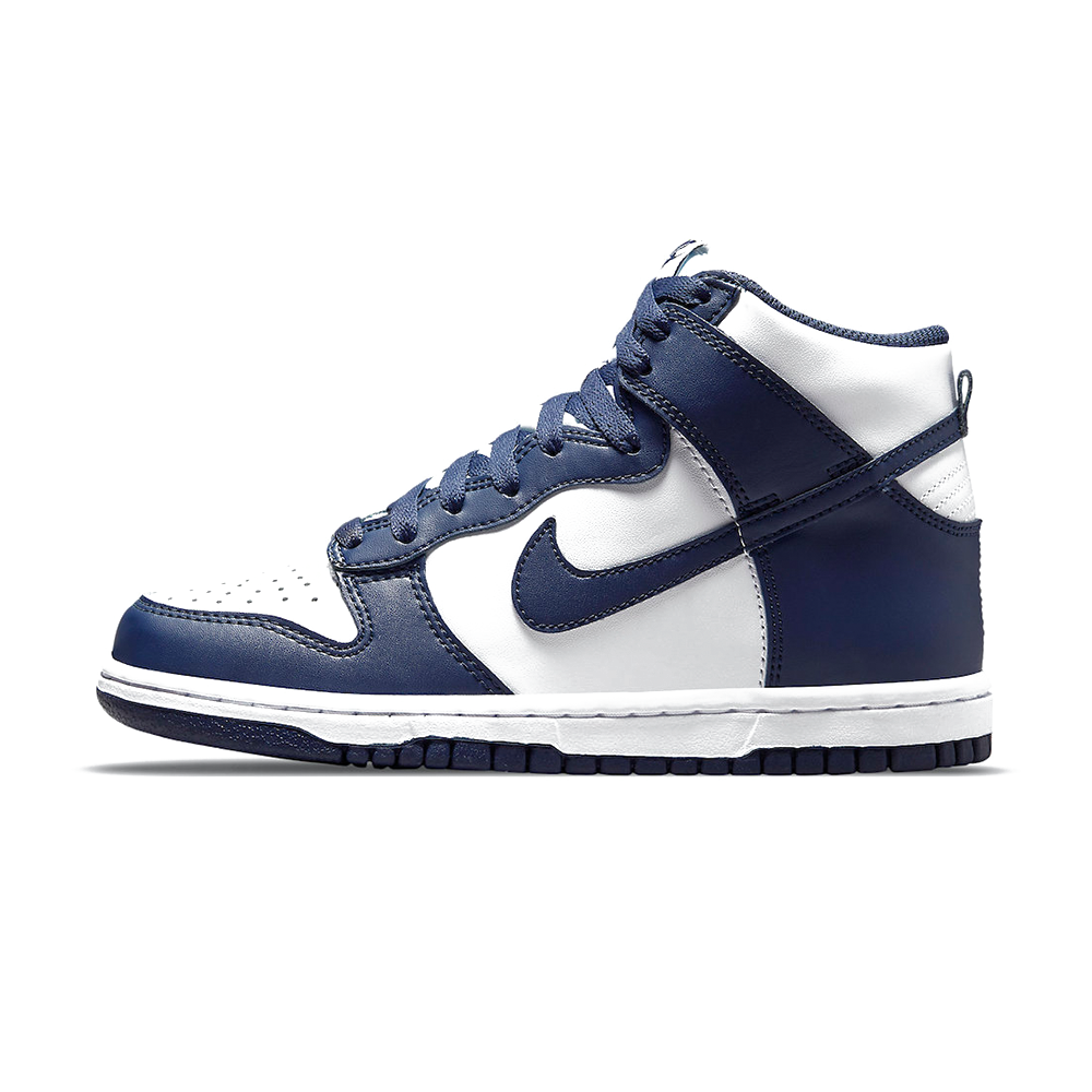 The Nike Dunk High Midnight Navy features a smooth white leather design with navy blue inserts on the eyelets, heel and mudguard. There is the usual Nike Air branding on the tongue, a back pull tab and matching laces. A blue outsole completes the harmonious design.